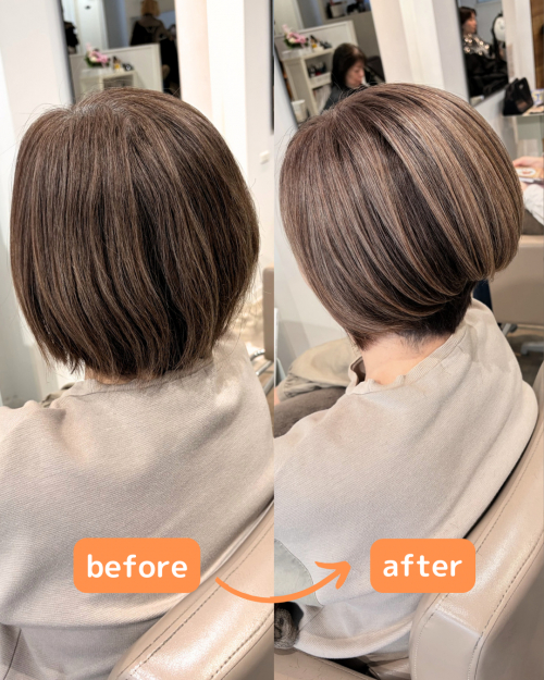 全体に自然な明るさとツヤが出て、重く見えやすい髪も軽やかな印象に。