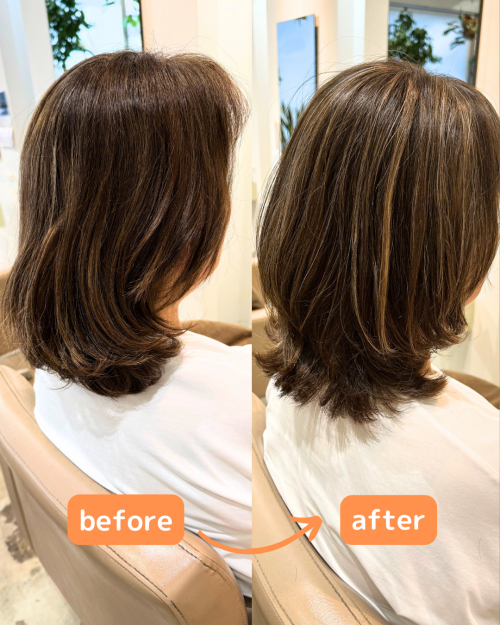 今回のスタイルは、細かいハイライトを使った白髪ぼかしに、くびれのあるミディアムスタイルを組み合わせています。