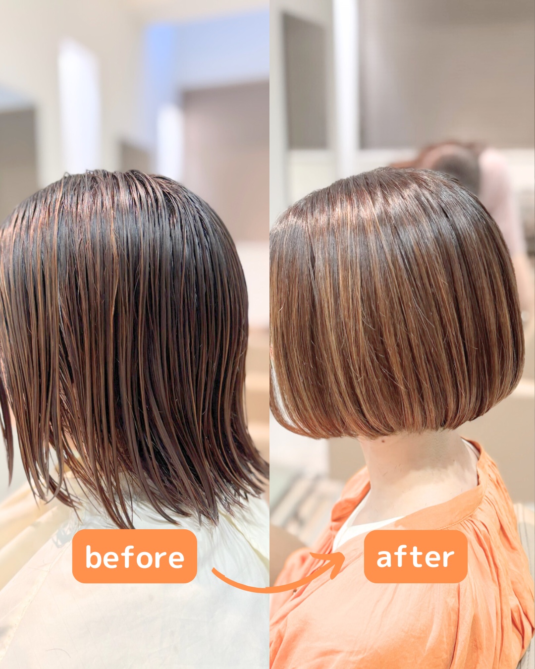 今回は、長さを整えながら丸みのあるボブにカットし、全体に細かくハイライトを入れて仕上げています。